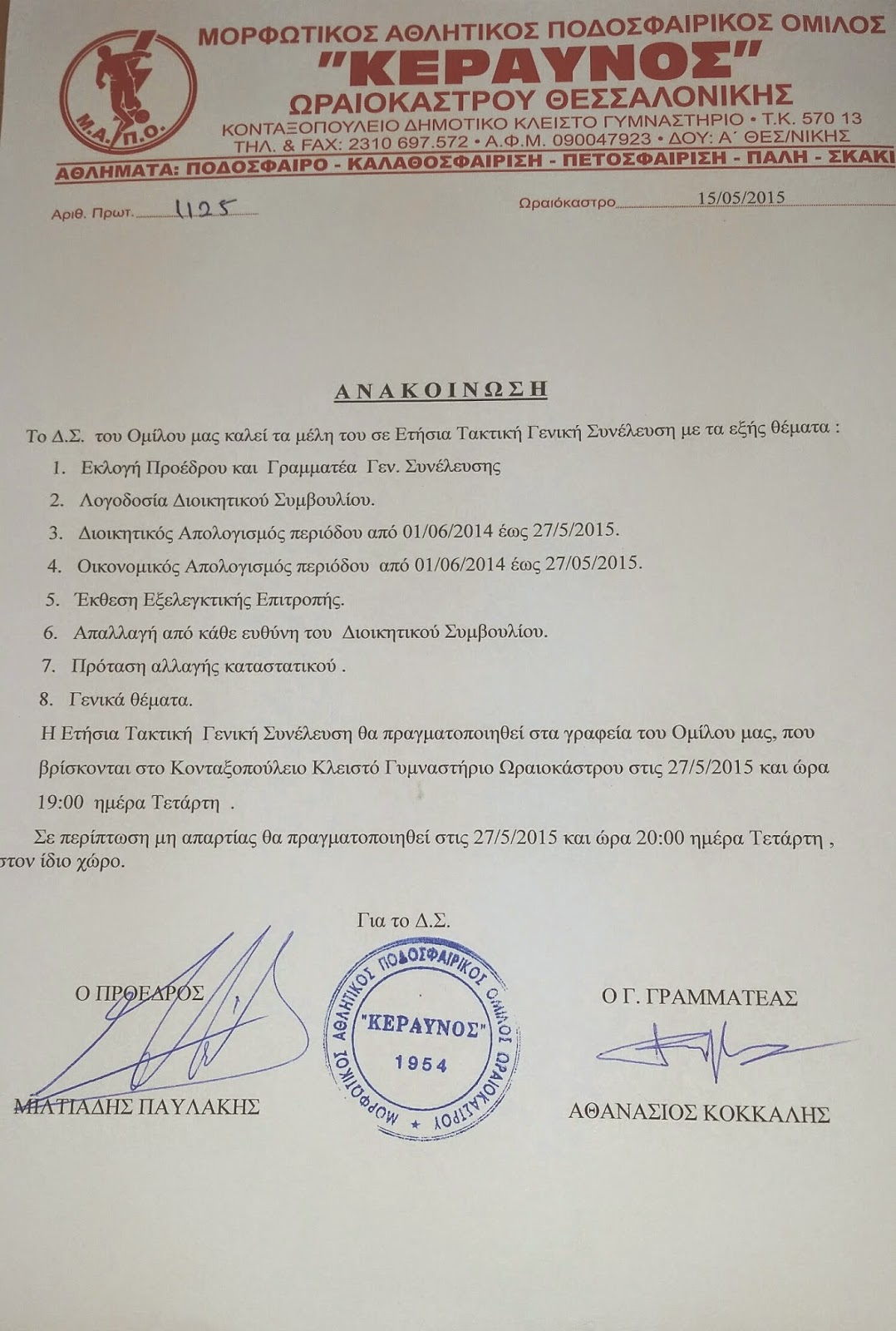 Ετήσια Τακτική Γενική Συνέλευση του Κεραυνού Ωραιοκάστρου