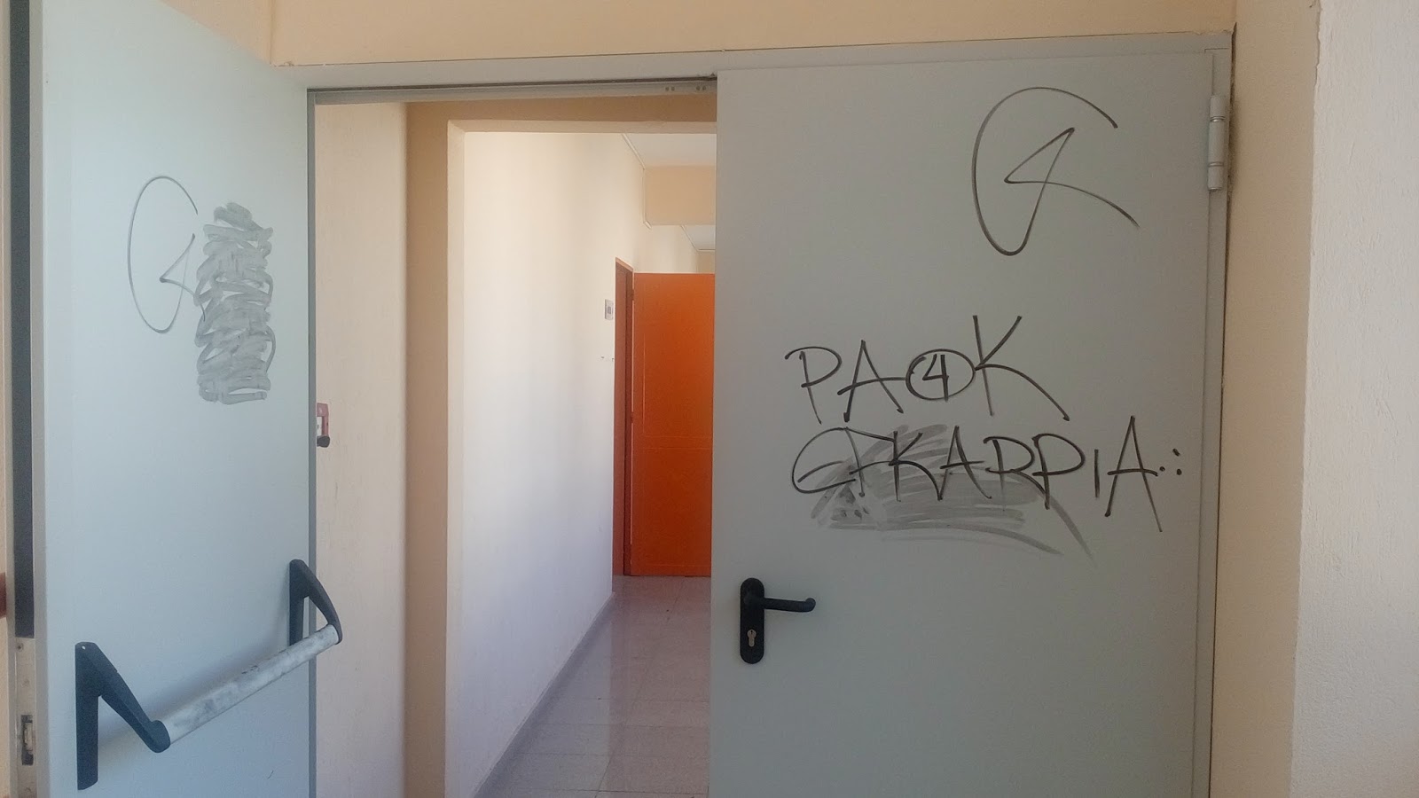 Στο δεύτερο κτίριο, στο οποίο έχουν γράψει τους τοίχους, παραβίασαν παράθυρο του 1ου ορόφου μπήκαν μέσα και έγραψαν συνθήματα στις εσωτερικές πόρτες των αιθουσών!!!