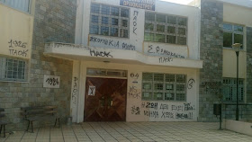 Τα δύο κτίρια του 1ου ΓΕΛ και του 1ου Γυμνασίου που  είχαν καθαρισθεί και βαφεί πριν λίγο καιρό, γέμισαν πάλι με συνθήματα (εδώ να τονίσουμε ότι και πριν μερικές ημέρες στο 1ο ΓΕΛ υπήρξαν και άλλα συνθήματα "ερωτευμένου" ατόμου που γράφοντας εξωτερίκευσε τον "πόνο" του!).