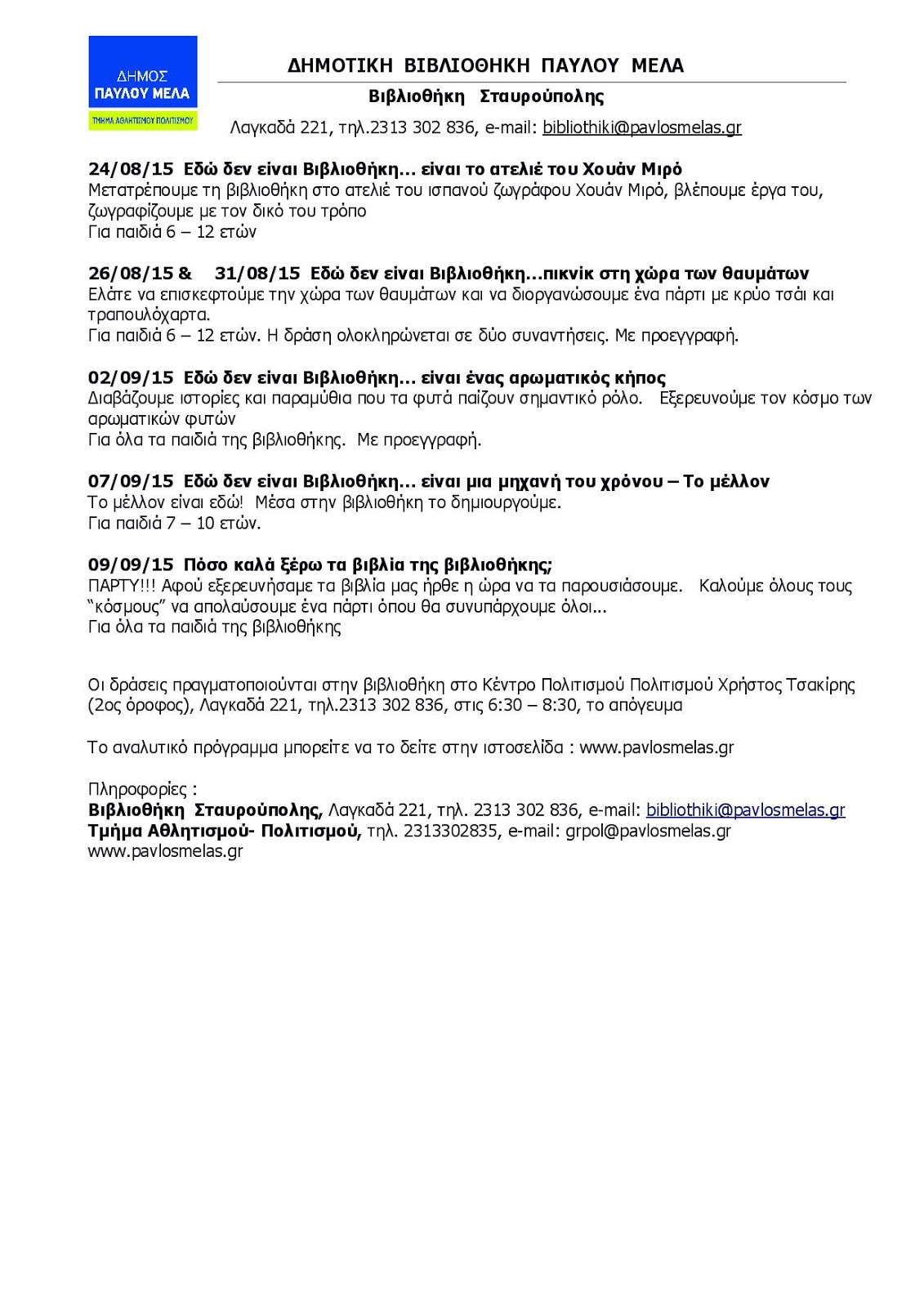 ΟΙ ΚΑΛΟΚΑΙΡΙΝΕΣ ΕΚΔΗΛΩΣΕΙΣ ΤΗΣ ΒΙΒΛΙΟΘΗΚΗΣ ΣΤΑΥΡΟΥΠΟΛΗΣ ΤΟΥ ΔΗΜΟΥ ΠΑΥΛΟΥ ΜΕΛΑ ΞΕΚΙΝΗΣΑΝ ΓΙΑ ΠΕΜΠΤΗ ΧΡΟΝΙΑ ΦΕΤΟΣ ΚΑΙ ΜΑΛΙΣΤΑ ΥΠΟ ΤΗΝ ΑΙΓΔΑ ΤΗΣ ΕΘΝΙΚΗΣ ΒΙΒΛΙΟΘΗΚΗΣ