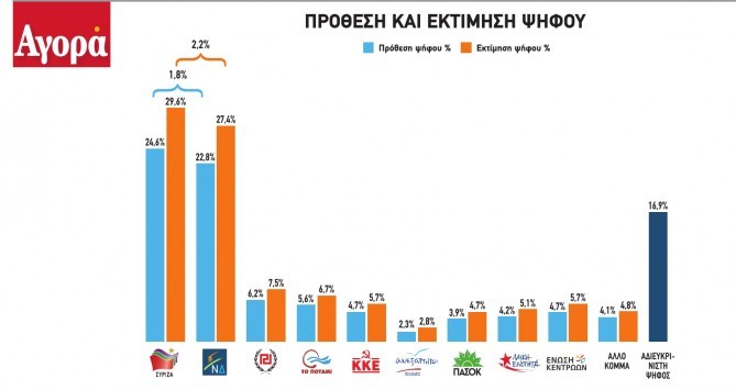 Συγκεκριμένα, στην πρόθεση ψήφου, ο ΣΥΡΙΖΑ λαμβάνει 24,6% έναντι του 22,8% της Νέας Δημοκρατίας. Ακολουθεί η Χρυσή Αυγή με ποσοστό 6,2%, το Ποτάμι με ποσοστό 5,6%, το ΚΚΕ με ποσοστό 4,7%, η Ένωση Κέντρου με 4,7%, η Λαϊκή Ενότητα με ποσοστό 4,2%, το ΠΑΣΟΚ με 3,9% και οι Ανεξάρτητοι Έλληνες με ποσοστό 2,3%.Άλλο κόμμα δήλωσε ότι θα ψηφίσει το 4,1% ενώ η αδιευκρίνιστη ψήφος διαμορφώνεται στο 16,9%.