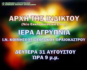 Ι.Ν.Κοιμήσεως Θεοτόκου Ωραιοκάστρου: Ιερά Αγρυπνία - Δευτέρα 31 Αυγούστου, 9.00 μμ