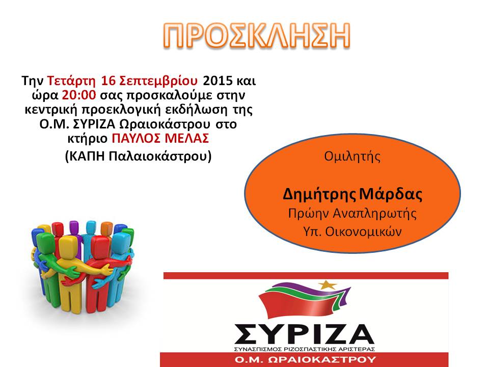 ΟΜ ΣΥΡΙΖΑ ΩΡΑΙΟΚΑΣΤΡΟΥ σας προσκαλεί στην κεντρική προεκλογική εκδήλωση