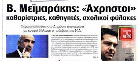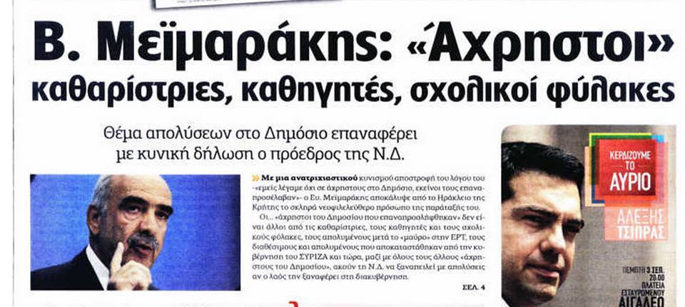 Με αποτροπιασμό, ακούσαμε τον Ε. Μεϊμαράκη να αναφέρει σε προεκλογική ομιλία του στην Κρήτη: "εμείς λέγαμε όχι σε άχρηστους στο δημόσιο, εκείνοι τους επαναπροσέλαβαν"
