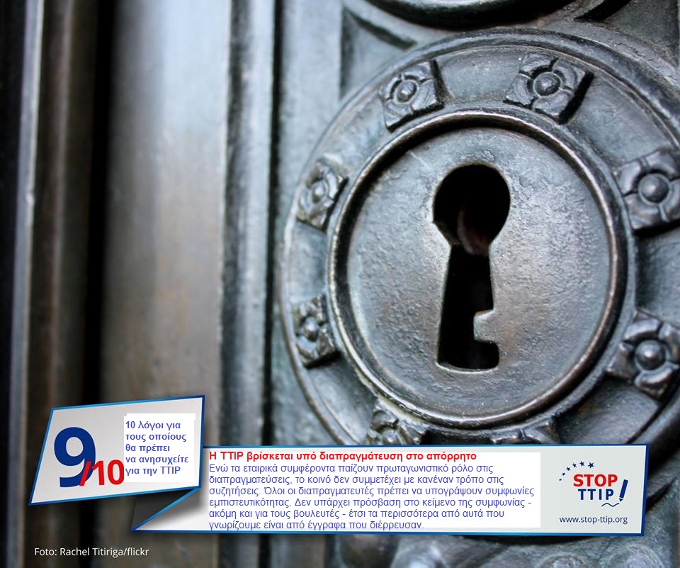 9/10 - Η ΤΤΙΡ βρίσκεται υπό διαπραγμάτευση στο απόρρητο. Ενώ τα εταιρικά συμφέροντα παίζουν πρωταγωνιστικό ρόλο στις διαπραγματεύσεις, το κοινό δεν συμμετέχει με κανέναν τρόπο στις συζητήσεις. Όλοι οι διαπραγματευτές πρέπει να υπογράψουν συμφωνίες εμπιστευτικότητας. Δεν υπάρχει πρόσβαση στο κείμενο της συμφωνίας - ακόμη και για τους βουλευτές - έτσι τα περισσότερα από αυτά που γνωρίζουμε είναι από έγγραφα που διέρρευσαν.