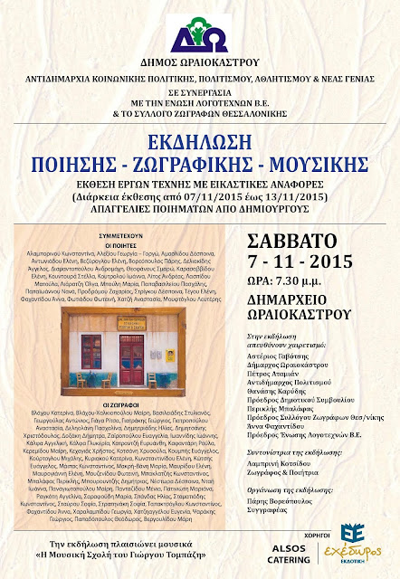 Δήμος Ωραιοκάστρου: Εκδήλωση ποίησης - ζωγραφικής - μουσικής, Σάββατο 7/11/2015, 7.30 μμ