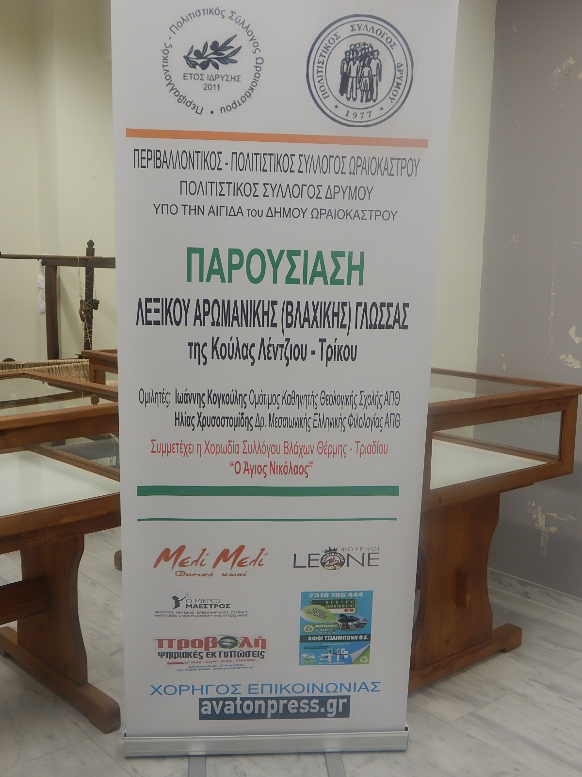 Με μεγάλη επιτυχία ολοκληρώθηκε το βράδυ του Σαββάτου η εκδήλωση που συνδιοργάνωσαν ο Περιβαλλοντικός - Πολιτιστικός Σύλλογος Ωραιοκάστρου και ο Πολιτιστικός σύλλογος Δρυμού με την παρουσίαση του Λεξικού Αρωμανικής (Βλάχικης) Γλώσσας της Κούλας Λέντζιου - Τρίκου. το έργο της κ Λέντζιου προλόγησαν ο ομότιμος καθηγητής ΑΠΘ κ Κογκούλης Ιωάννης και ο Δρ Μεσαιωνικής Ελληνικής Φιλολογίας ΑΠΘ κ Ηλίας Χρυσοστομίδης.