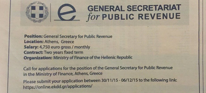 Σύμφωνα με την καταχώριση, ο μηνιαίος μισθός για τον επικεφαλής της ΓΓΔΕ ανέρχεται στα 4.750 ευρώ με συμβόλαιο δύο χρόνων. Από τα παραπάνω γίνεται αντιληπτό ότι ουδείς εκ των στελεχών του εξωτερικού θα μπορούσε να υποβάλει αίτηση, δεδομένου ότι η ημερομηνία είχε παρέλθει, ενώ όσοι δοκίμαζαν να καλέσουν στο νούμερο που υπήρχε στην καταχώριση σίγουρα δεν θα συνομιλούσαν με στελέχη του υπουργείου Οικονομικών στην Ελλάδα