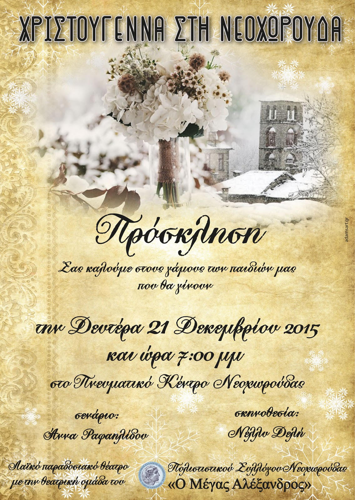 Το ΛΑΪΚΟ ΠΑΡΑΔΟΣΙΑΚΟ ΘΕΑΤΡΟ ΤΟΥ ΠΟΛΙΤΙΣΤΙΚΟΥ ΣΥΛΛΟΓΟΥ ΝΕΟΧΩΡΟΥΔΑΣ «Ο ΜΕΓΑΣ ΑΛΕΞΑΝΔΡΟΣ» ΠΑΡΟΥΣΙΑΖΕΙ ΤΟ ΘΕΑΤΡΙΚΟ ΕΡΓΟ «ΧΡΙΣΤΟΥΓΕΝΝΑ ΣΤΗ ΝΕΟΧΩΡΟΥΔΑ»
