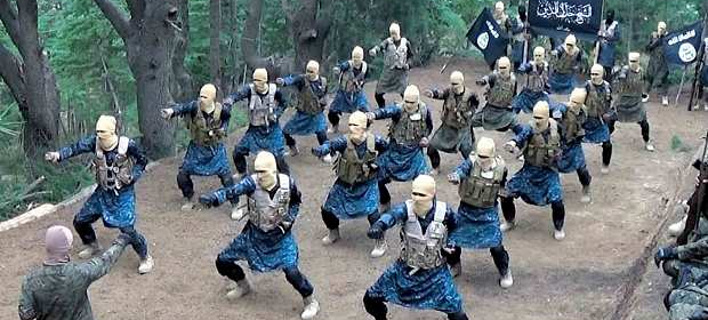 Κουκουλοφόροι τρομοκράτες ποζάρουν με πιστόλια και πυραυλοκίνητους εκτοξευτές χειροβομβίδων. Φορούν στολές παραλλαγής, ενώ πίσω τους ανεμίζει η σημαία του Ισλαμικού Κράτους.