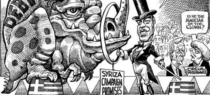 Το σκίτσο του Kevin Kallaugher (η ΚΑL όπως υπογράφει), τοποθετεί τον Αλέξη Τσίπρα στη μέση της σκηνής ενός τσίρκο, να προσπαθεί να κάνει ένα δύσκολο νούμερο.
