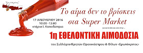 Σε μια εποχή που οι ανάγκες για αίμα είναι πιεστικές, που χειρουργεία αναβάλλονται λόγω έλλειψης αίματος, που ζωές συνανθρώπων μας κινδυνεύουν, δεν πρέπει και ούτε θα μείνουμε απαθείς. Ο Σύλλογος Κρητών Ωραιοκάστρου & Φίλων «Ερωτόκριτος» καλεί όσους μπορούν να προσφέρουν αίμα, ιδίως τους νέους ανθρώπους, να αποδείξουμε ότι η αλληλεγγύη και η ανθρωπιά μας υπάρχει ακόμα. Εθελοντική Αιμοδοσία την Κυριακή 17 Ιανουαρίου 2016 στο κτήριο Ιωάννης Καποδίστριας Ωραιοκάστρου.