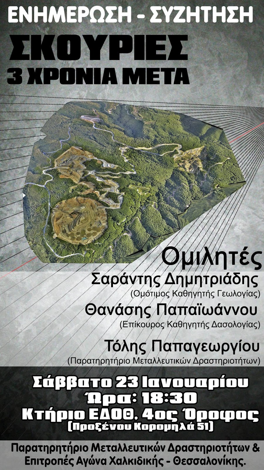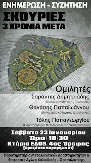 Η εκδήλωση θα πραγματοποιηθεί στον 4ο όροφο της Ε.Δ.Ο.Θ. (Προξένου Κορομηλά 51)Στην εκδήλωση δόθηκε ο τίτλος «Σκουριές, τρία χρόνια μετά. ΑΠΟΚΑΛΥΨΗ ΤΩΡΑ». Τρία χρόνια μετά την έναρξη της υλοτόμησης του δάσους στις Σκουριές, η έκθεση κάνει μια συγκριτική παρουσίαση των πεπραγμένων της εταιρείας στις Σκουριές, σε σχέση με τη Μελέτη Περιβαλλοντικών Επιπτώσεων και τους όρους της ΑΕΠΟ και των λοιπών εγκρίσεων. Τα αποτελέσματα είναι πραγματικά αποκαλυπτικά για την εταιρεία αυτή που επικαλείται τη νομιμότητα, επιδεικνύοντας παράλληλα την απόλυτη περιφρόνηση της γι' αυτήν. Είναι επίσης αποκαλυπτικά για τις δημόσιες υπηρεσίες που επέτρεψαν και ανέχτηκαν τη δημιουργία ενός «κράτους εν κράτει» στη Χαλκιδική.