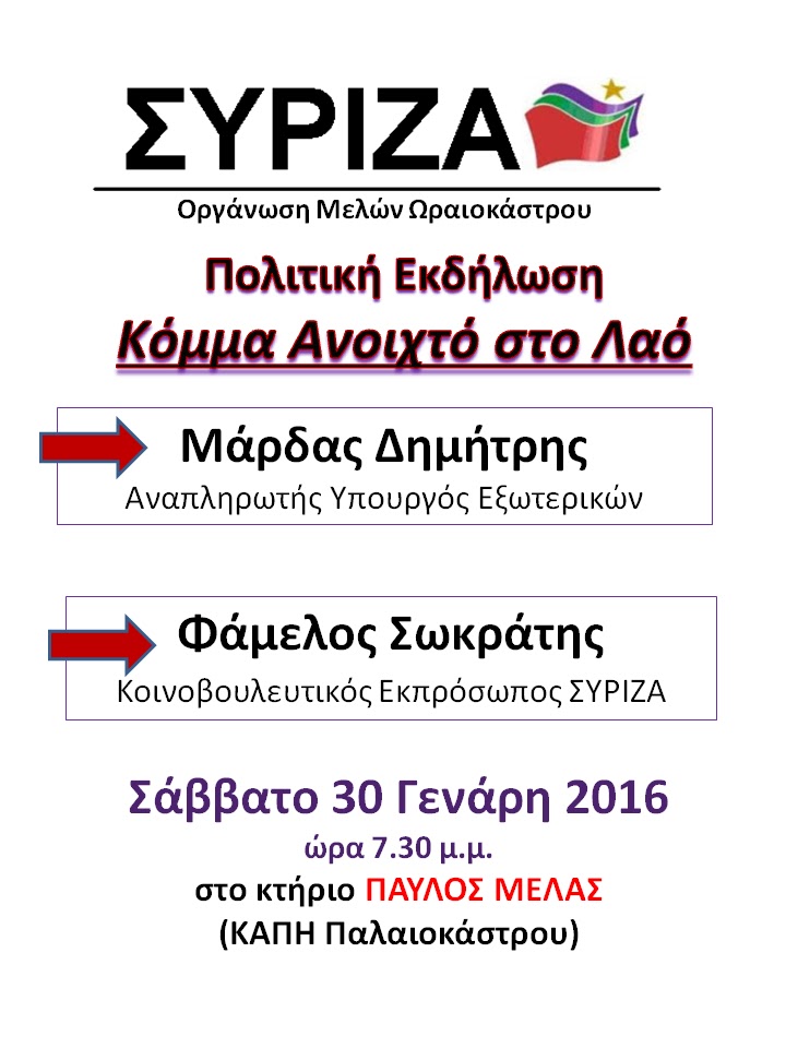 Εκδήλωση ΣΥΡΙΖΑ Ωραιοκάστρου: "Κόμμα Ανοιχτό στο Λαό"