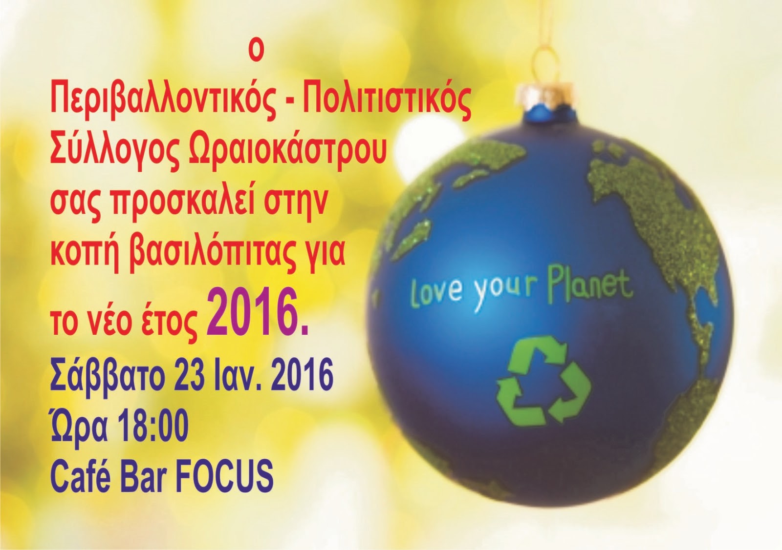 Έχουμε την χαρά να προσκαλέσουμε τα Μέλη και τους Φίλους μας στην κοπή της Πρωτοχρονιάτικης Πίτας τουΠεριβαλλοντικού – Πολιτιστικού Συλλόγου Ωραιοκάστρου, που θα πραγματοποιηθεί το Σάββατο 23 Ιανουαρίου 2016 και ώρα18:00 στο Café Bar FOCUS (Λεωφόρος Δημοκρατίας 32).