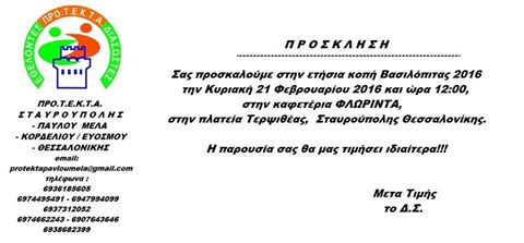 Κοπή βασιλόπιτας της ΠΡΟ.Τ.Ε.Κ.Τ.Α., Κυριακή 21 Φεβρουαρίου 2016, 12.00 μμ