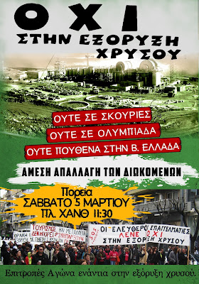 Οι Επιτροπές Αγώνα ενάντια στην εξόρυξη χρυσού καλούν σε πορεία διαμαρτυρίας στη Θεσσαλονίκη , το Σάββατο 5 Μαρτίου, συγκέντρωση 11:30πμ - πλατεία ΧΑΝΘ