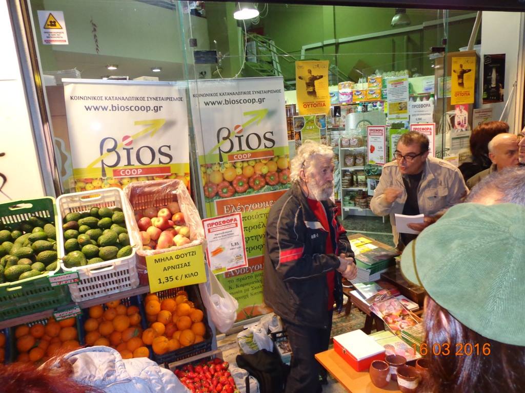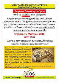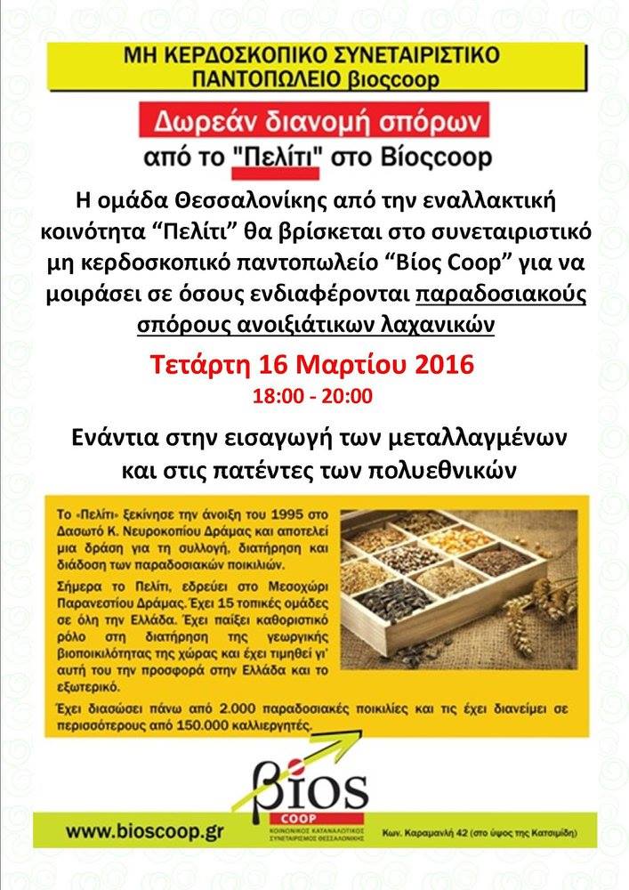 "Ένας άλλος κόσμος είναι υπαρκτός: 2.500 φάκελοι με παραδοσιακούς σπόρους από την εναλλακτική κοινότητα "Πελίτι" διανεμήθηκαν δωρεάν στο χώρο του συνεταιριστικού μη κερδοσκοπικού παντοπωλείου "Βίος Coop", σε εκατοντάδες πολίτες, που περίμεναν υπομονετικά στη μεγάλη ουρά που σχηματίσθηκε από τις 6:00 έως τις 8:00 μμ, την Τετάρτη 16.3.2016. Οι σπόροι αφορούσαν ντομάτες, πιπεριές, μελιτζάνες, αγγούρια, κολοκυθάκι, ρόκα, καλαμπόκι, βασιλικό, δυόσμο, κατηφέ."