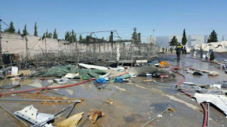 Σύμφωνα με μαρτυρίες, μέχρι στιγμής έχουν καεί περίπου δέκα σκηνές. Στο κέντρο διαμένουν εκατοντάδες πρόσφυγες και μετανάστες.