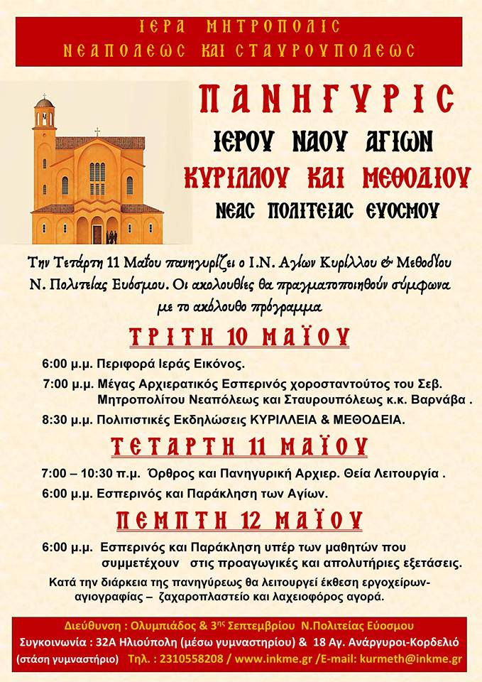 Πανήγυρις Ι.Ν. Αγίων Κυρίλλου και Μεθοδίου Νέας Πολιτείας Ευόσμου - Εκδηλώσεις