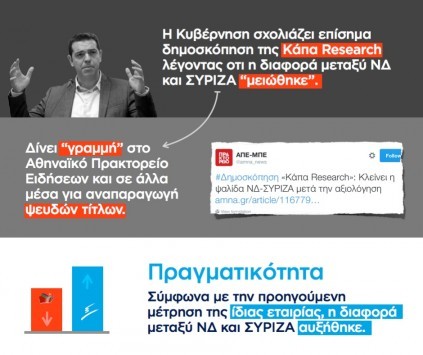 Πιο συγκεκριμένα αναγράφεται: "Η Κυβέρνηση σχολιάζει επίσημα δημοσκόπηση της Κάπα Research λέγοντας ότι η διαφορά μεταξύ ΝΔ και ΣΥΡΙΖΑ μειώθηκε. Δίνει "γραμμή" στο Αθηναϊκό Πρακτορείο Ειδήσεων και σε άλλα μέσα για αναπαραγωγή ψευδών τίτλων. Πραγματικότητα: Σύμφωνα με την προηγούμενη μέτρηση της ίδιας εταιρείας, η διαφορά μεταξύ ΝΔ και ΣΥΡΙΖΑ αυξήθηκε" ενώ υπάρχει και φωτογραφία από ένα tweet του ΑΠΕ που αναφέρει πως "κλείνει η ψαλίδα μετά την αξιολόγηση".