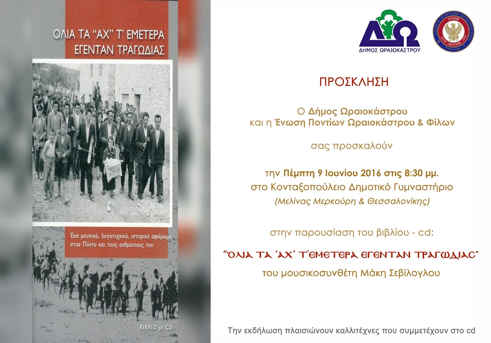 Παρουσίαση βιβλίου - cd του μουσικοσυνθέτη Μάκη Σεβίλογλου “ΟΛΙΑ ΤΑ "ΑΧ" Τ'ΕΜΕΤΕΡΑ ΕΓΕΝΤΑΝ ΤΡΑΓΩΔΙΑΣ”, Πέμπτη 9 Ιουνίου, 8.30 μμ