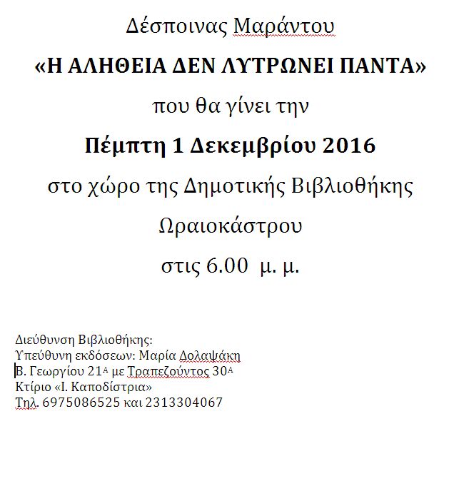 Ωραιόκαστρο: Παρουσίαση βιβλίου "Η αλήθεια δεν λυτρώνει πάντα"