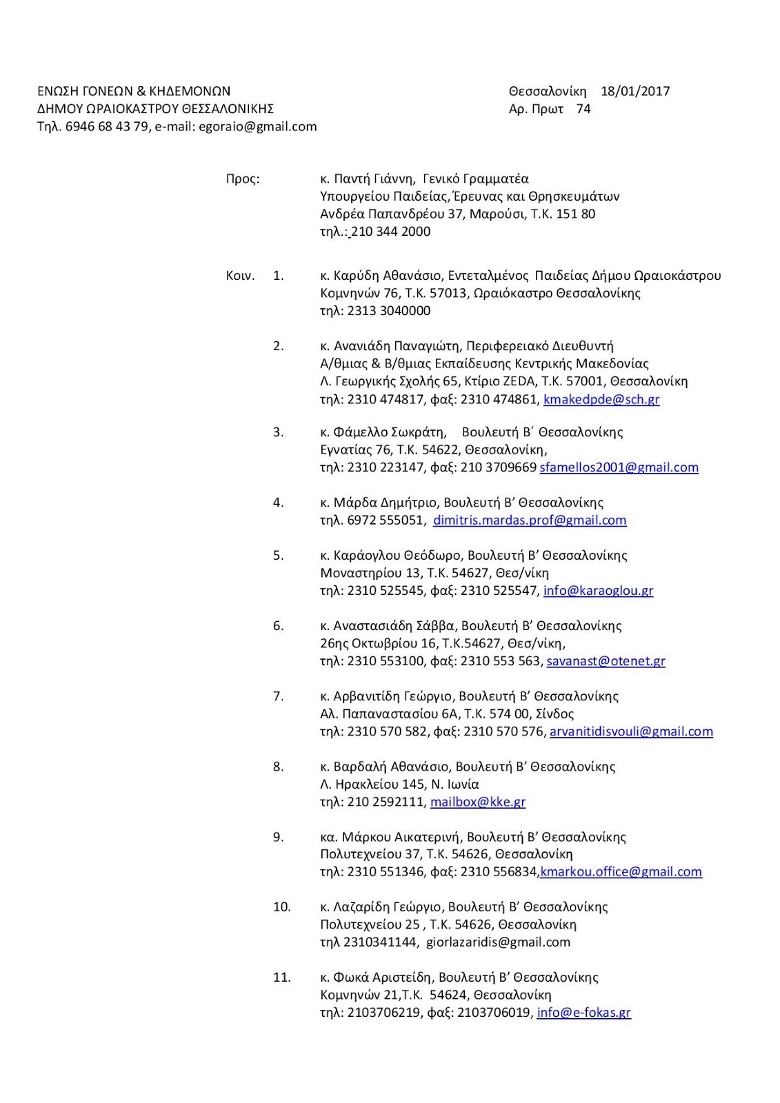 Έγγραφη διαμαρτυρία της Ένωσης Γονέων Ωραιοκάστρου για τα προσφυγόπουλα που θα φιλοξενηθούν στα σχολεία του δήμου