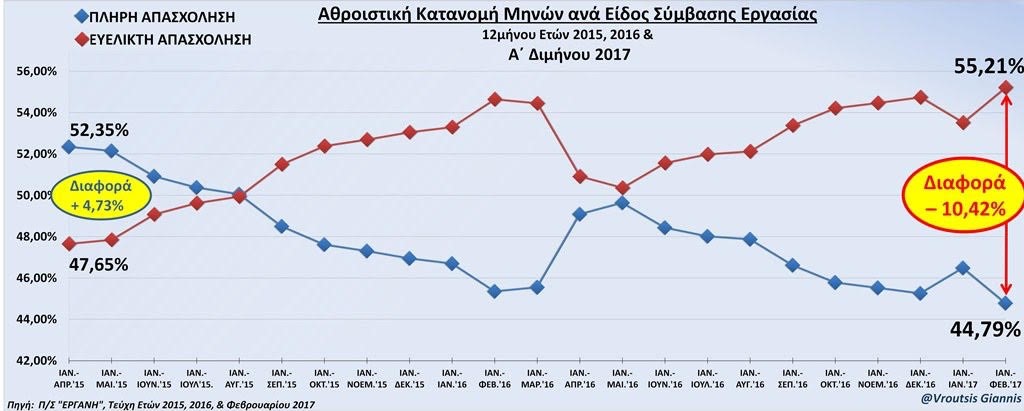 Οι ευέλικτες μορφές απασχόλησης σημείωσαν νέο αρνητικό ρεκόρ, φανερώνοντας ξεκάθαρα ότι η “ψαλίδα” από την πλήρη απασχόληση διευρύνεται πλέον ανεξέλεγκτα (-10,42%)!