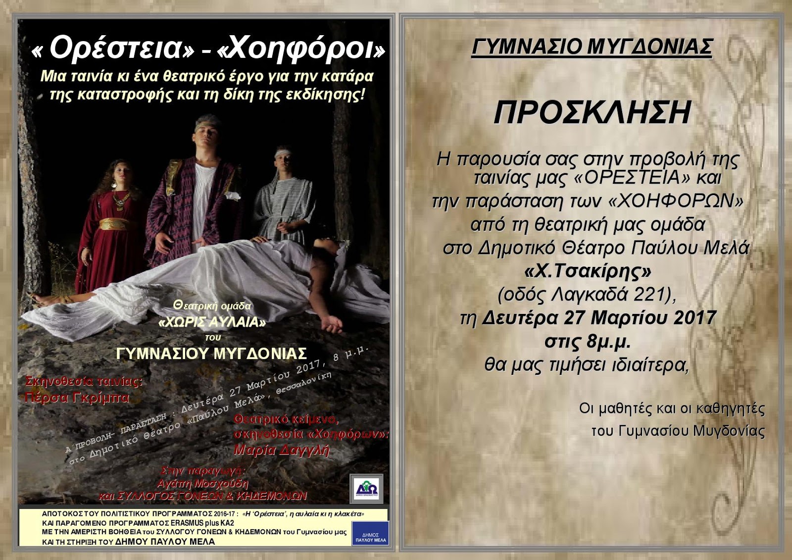 Γυμνάσιο Μυγδονίας: Προβολή ταινίας και θεατρική παράσταση στο δημ θέατρο Χ. Τσακίρης