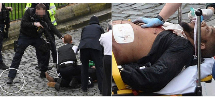 Βρίσκεται τραυματίας στον περιβάλλοντα χώρο του βρετανικού Κοινοβουλίου και οι τραυματιοφορείς αφού του έχουν δώσει τις πρώτες βοήθειες τον μεταφέρουν στο ασθενοφόρο.