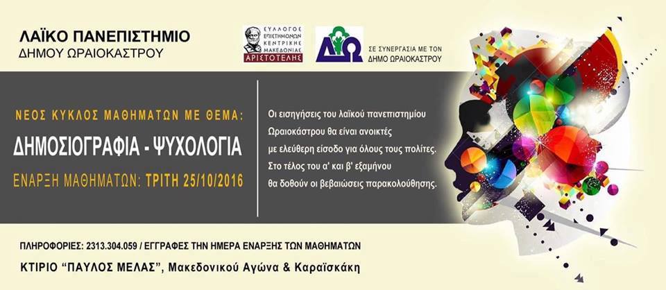Λαϊκού Πανεπιστημίου που συνδιοργανώνει ο δήμος Ωραιοκάστρου με τον Σύλλογο Επιστημόνων
