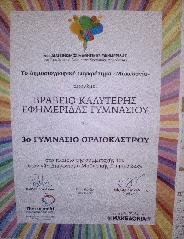 Βραβείο καλύτερης εφημερίδας στο 3ο Γυμνάσιο Ωραιοκάστρου από το δημοσιογραφικό συγκρότημα “Μακεδονία”